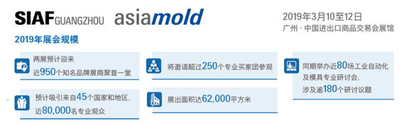 第十三屆廣州國際模具展覽會(Asiamold)201931012日再度在廣州中國進出口商品交易會展館舉行,聯手SIAF廣州國際工業自動化技術及裝備展覽會,兩展將共同展示貫穿從模具、3D打印、智能制造,到生產自動化的工業生產鏈,助力業界開拓“中國制造2025”戰略所帶來的龐大商機。。