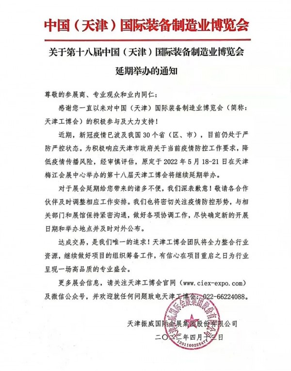 感謝您一直以來對中國(天津)國際裝備制造業博覽會(簡稱:天津工博會)的積極參與及大力支持! 近期,新冠疫情已波及我國30個省(區、市),目前仍處于嚴防嚴控狀態。為積極響應天津市政府關于當前疫情防控工作要求,降低疫情傳播風險,經審慎評估,原定于2022年5月18-21日在天津梅江會展中心舉辦的第十八屆天津工博會將繼續延期舉辦。具體時間另行通知。