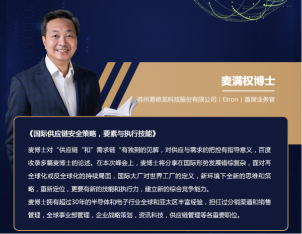 1.麥滿(mǎn)權(quán)博士 蘇州易德龍科技股份有限公司(Etron)首席業(yè)務(wù)官:《國(guó)際供應(yīng)鏈安全策略,要素與執(zhí)行技能》