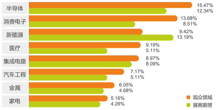 從上圖中可以看出,TOP8觀眾應用領域和展商關注的應用領域高度重合,尤其是半導體、消費電子和新能源領域,由此可見慕尼黑華南激光展對于行業內人士是非常好的商貿配對平臺,為展商和觀眾構建互通橋梁。未來,慕尼黑華南激光展也將繼續重點、精細化開發這些板塊觀眾,最大限度促進供需雙方達成合作。