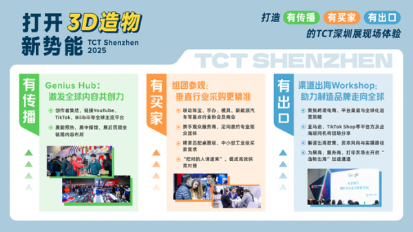 依托TCT全球品牌網絡,2025年TCT深圳展將聚焦3D打印技術與產品生態,打造有傳播、有買家、有出口的TCT深圳展現場體驗,為專業觀眾帶來一站式現場對接真實采購與生產落地需求。